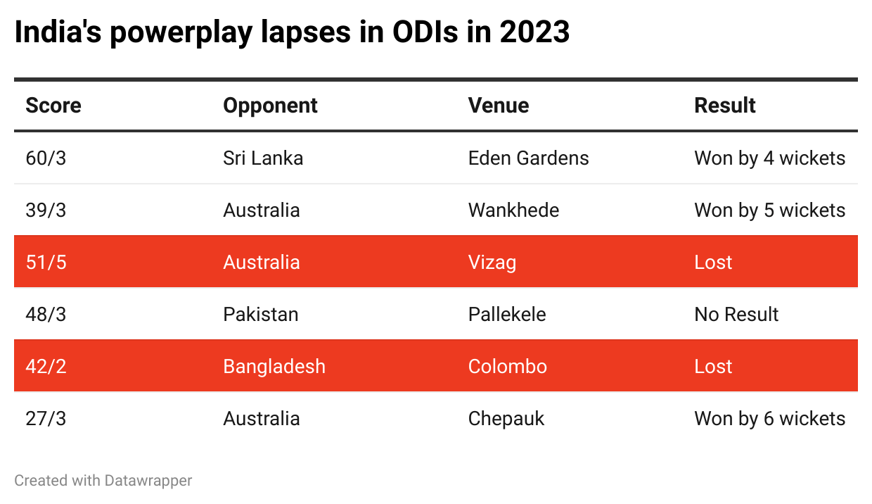 This calendar year, India have lost 2+ wickets in the powerplay six times. They’ve lost two of those six games, come close to losing two more (vs Australia in Chennai and Wankhede) and there was a no result in Pallekele against this very Pakistan side where they got bowled out for 266.