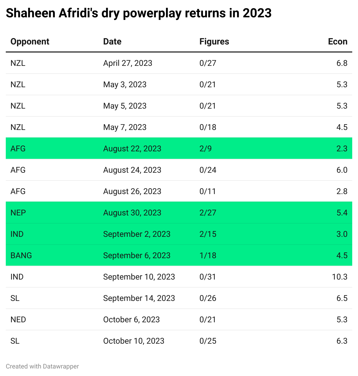 Good thing Pakistan have Shaheen, right? Well, yes, but the problem is that Shaheen has been sub-par with the new ball this year. That burst in Pallekele last month was terrific, yes, but this year he’s averaging 42 in overs 1-10 and has gone wicketless in the powerplay 10/14 times. That’s 71% of the time.