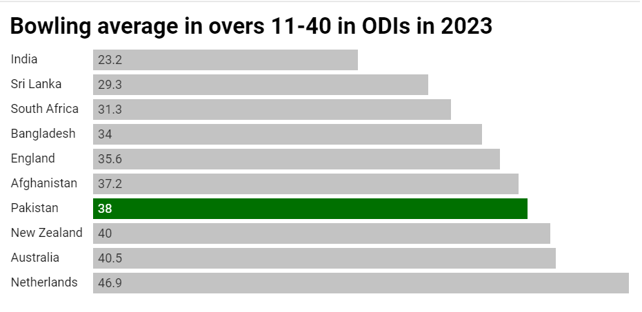 This year, Pakistan are averaging 38.00 in overs 11-40, which is the fourth-worst among teams participating in this World Cup. In the 11-30 phase (new-ish ball outside the powerplay), this average increases to 46.00.