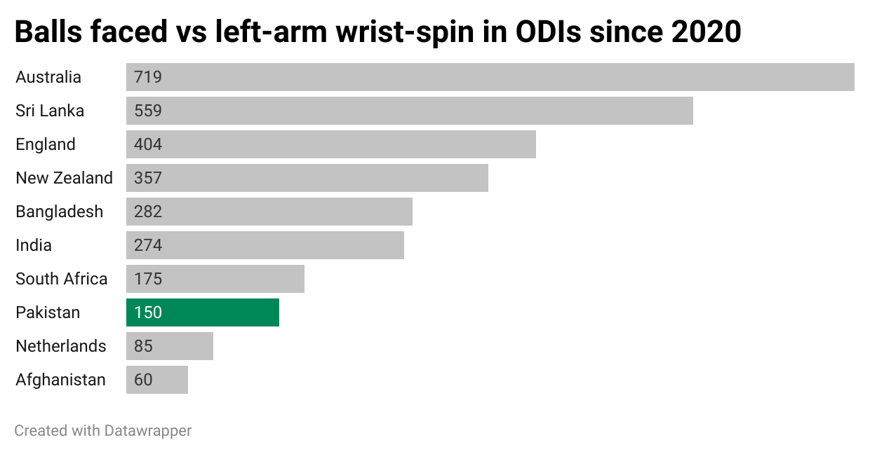 Since 2020, Pakistan have faced just 25 overs of left-arm wrist spin, which is the third-lowest among the teams participating in this World Cup.
