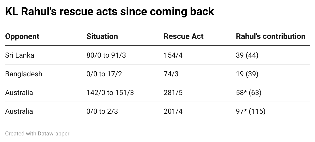 Since coming back into the side last month, Rahul has played 7 innings and has faced at least 30 balls in every innings. Thrice, he walked in with the side having lost quick wickets (vs Sri Lanka & Bangladesh in Colombo and vs Australia in Chennai) and on all three occasions, he managed to stop the slide by occupying the crease, absorbing pressure and sucking the momentum out of the opposition bowlers.