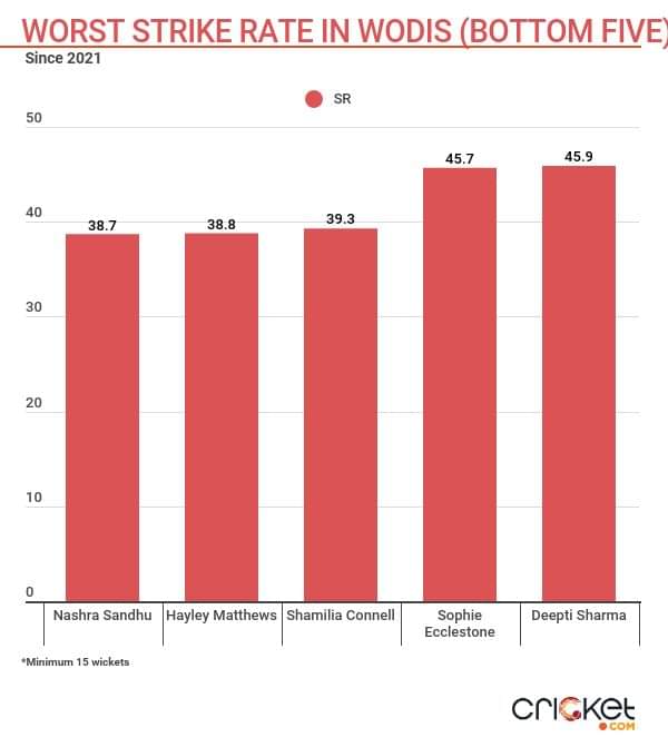 In 14 innings since 2021, Ecclestone had picked 18 wickets at a strike rate of 45.7, which is the second-worst among players with a minimum of 15 wickets.