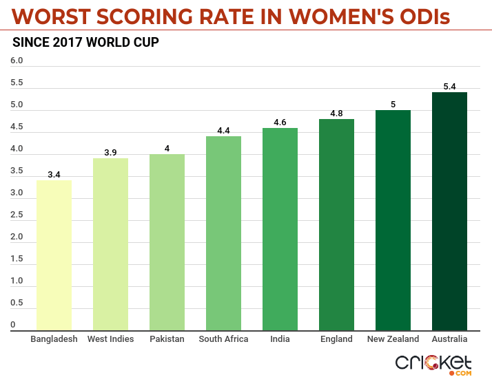 The surfaces in New Zealand have been conducive to high-scoring matches and South Africa could struggle against formidable batting units like Australia, New Zealand, England and India. Amongst all the eight teams featuring in the World Cup, South Africa have the fifth-worst scoring rate since the last showpiece event. Chloe Tryon (111.6), Kapp (89.8) and Lee (81.6) are the only ones with a strike rate of over 80, while the likes of du Preez (73.6), Wolvaardt (68), Trisha Chetty (64.1) and Luus (58.9) have all struggled to score at a decent pace. And, this could hurt them against teams like Australia and New Zealand, especially in the knockouts.