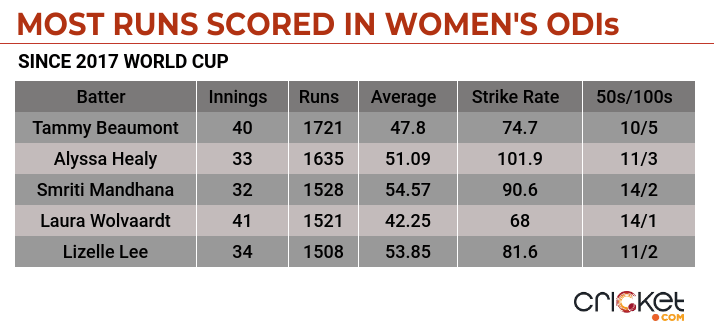 The two batters have done the majority of the scoring for South Africa, while the likes of Mignon du Preez, Marizanne Kapp and Luus too have decent numbers in the middle-order. Overall, South Africa have the third-best batting average (30.6) and second-best ball/wicket (41.3) since the last 50-over World Cup. Their boundary percentage of 44.55 is also the second-best amongst all other eight teams featuring in the forthcoming mega event.