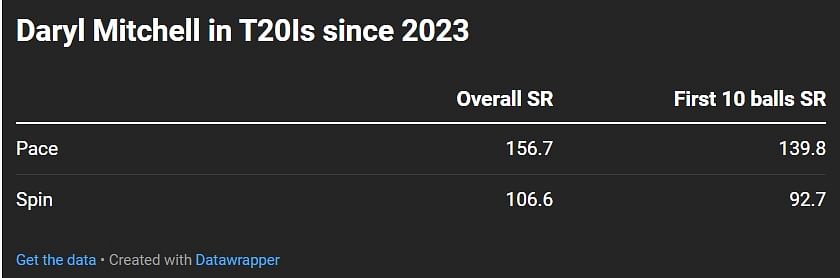 Mitchell had a killer run opening the batting for the Blackcaps in the 2021 T20 World Cup, but his middle-order numbers in T20Is do not make for good reading: the 33-year-old, across his last 15 T20I innings (which have predominantly come at No.5), has averaged 19.10 while striking at 130.10.