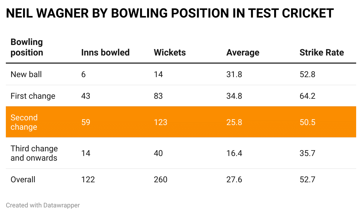 Wagner was most productive as their second-change bowler where he bowled in 59 innings. It is a position teams usually leave for an all-rounder. You can sense it by the highest wicket-taking second-change pacer which is Jacques Kallis with 139 wickets. Wagner is second on the list with 123 wickets (47.3% of his career wickets), followed by Courtney Walsh (mainly a frontline bowler), Ben Stokes, Andrew Flintoff and Dwayne Bravo. He averaged 25.8 as the second-change pacer, much better than when he came to bowl earlier.