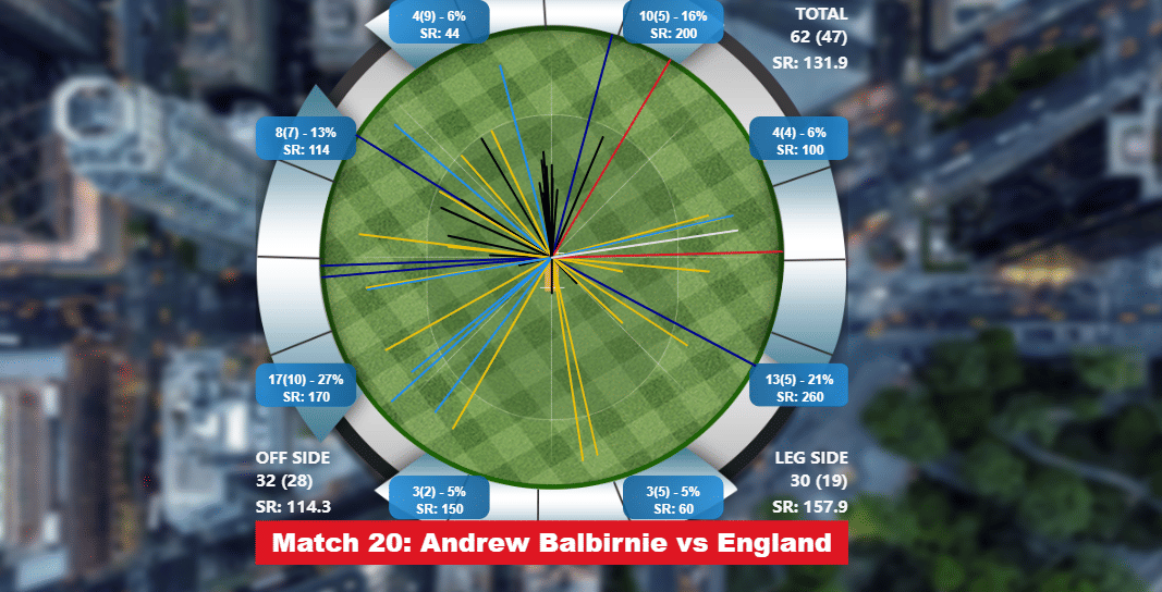 Even though put significantly on the backfoot, Ireland never gave up, which only amplified in the second half of the innings. Understanding the nuances of the pitch, Ireland bowled 28% of their deliveries on a good length in the powerplay, something that paid off. The dividends were there to see, with Joshua Little picking up both Alex Hales and Buttler in the first two overs.