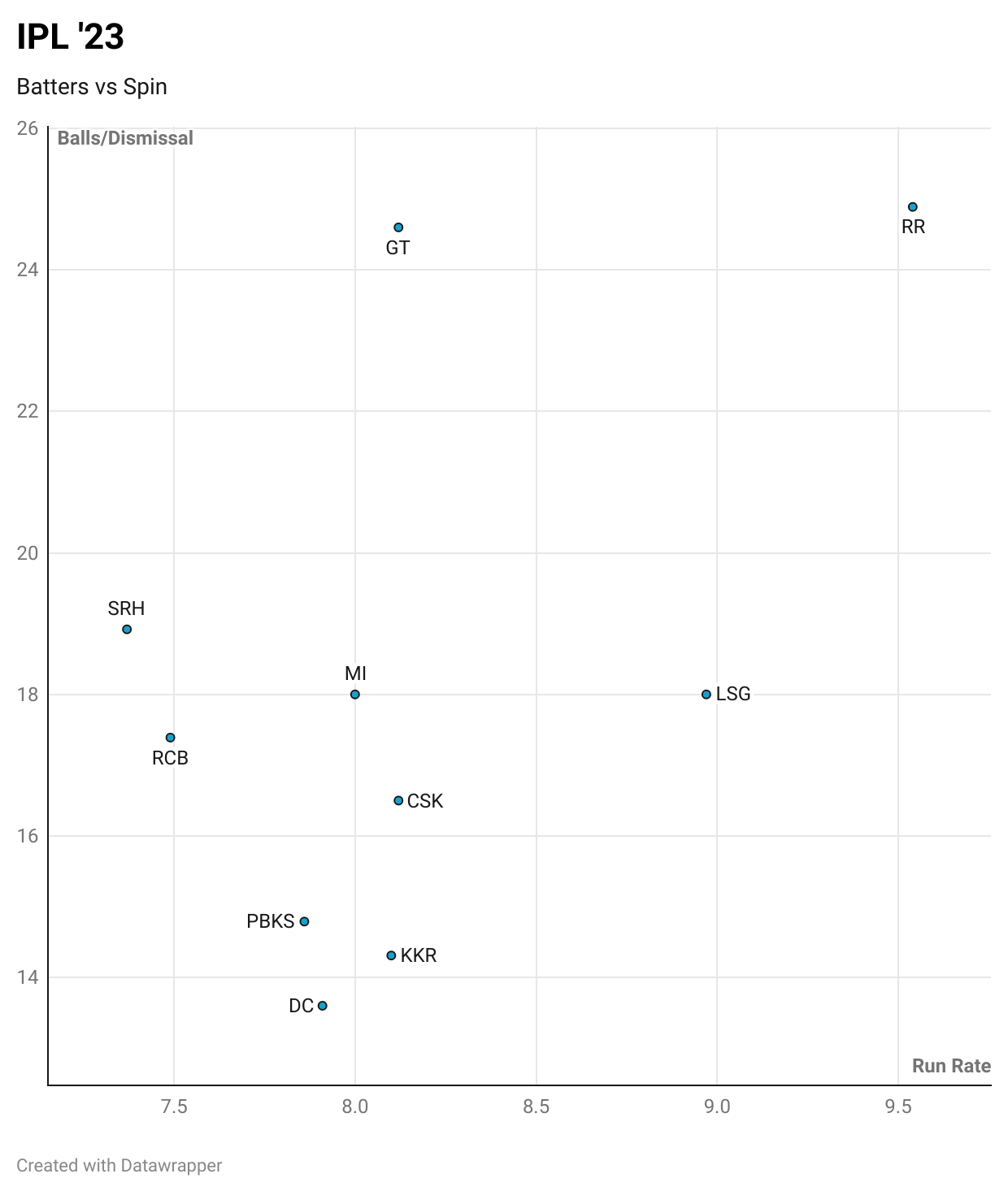 > Hyderabad batters have been very circumspect while playing spin this season. They have the third best balls/dismissal while playing spin, but have the poorest run rate. Meanwhile, Piyush Chawla has been in very good form for the Mumbai Indians, and will look to exploit this flaw.