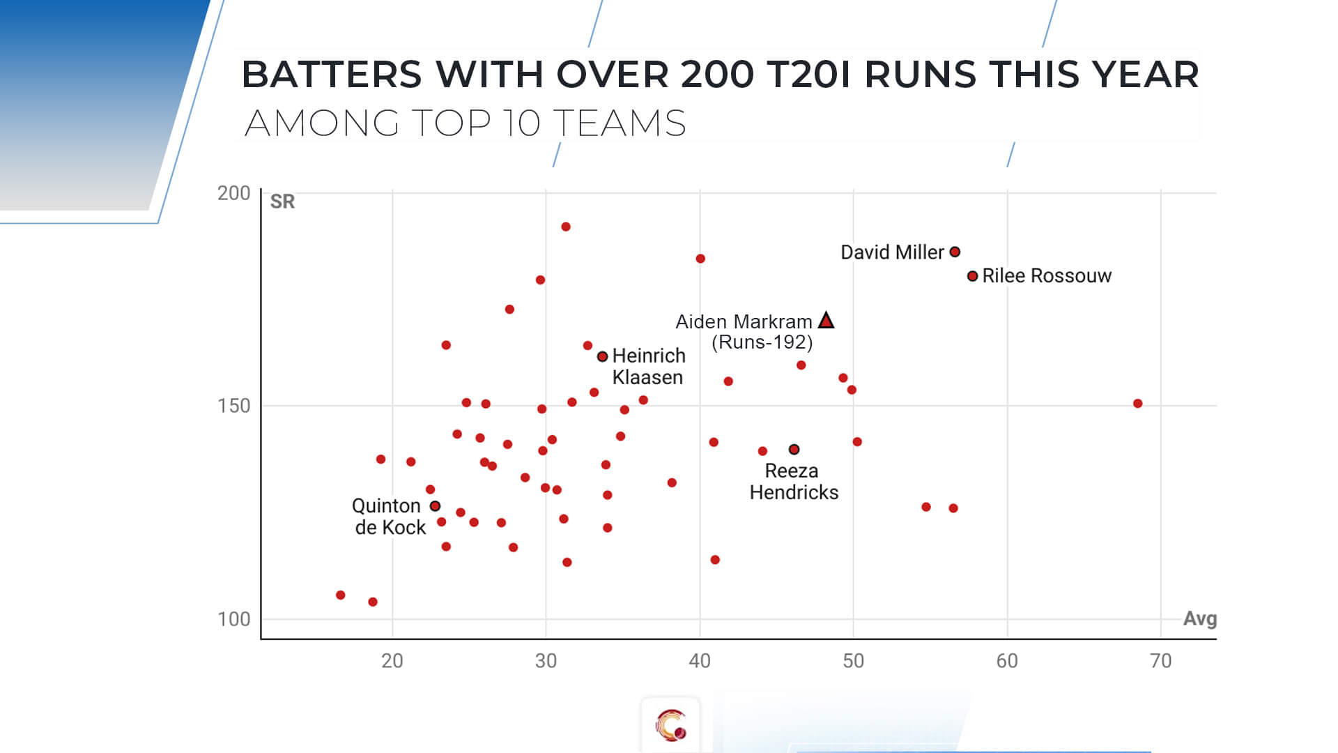 Top Run-scorer: Rassie van der Dussen – 177 runs @ 59 and 116.4 SR