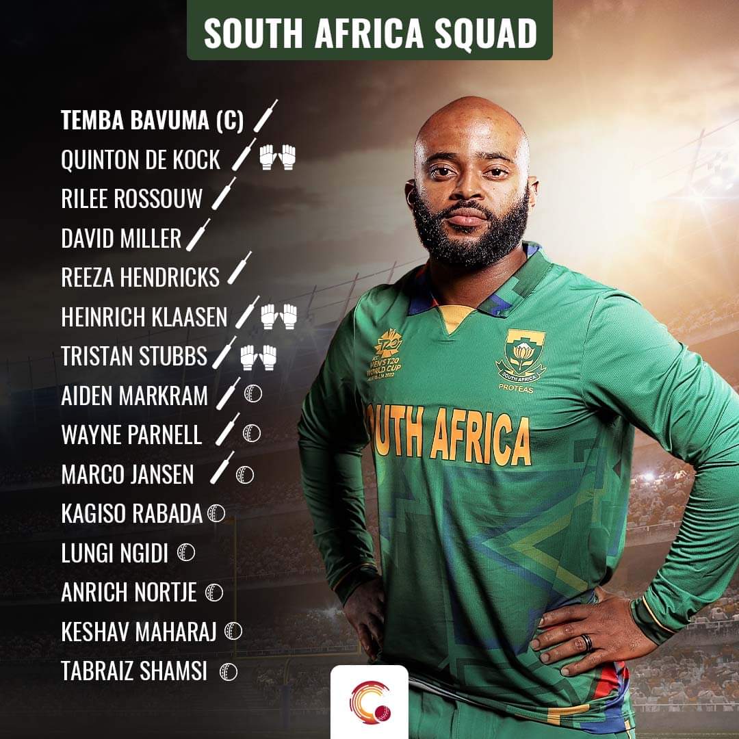 Temba Bavuma ( c ), Quinton de Kock (wk), Rilee Rossouw, Aiden Markram, David Miller, Tristan Stubbs, Wayne Parnell, Keshav Maharaj, Kagiso Rabada, Anrich Nortje, Lungi Ngidi
