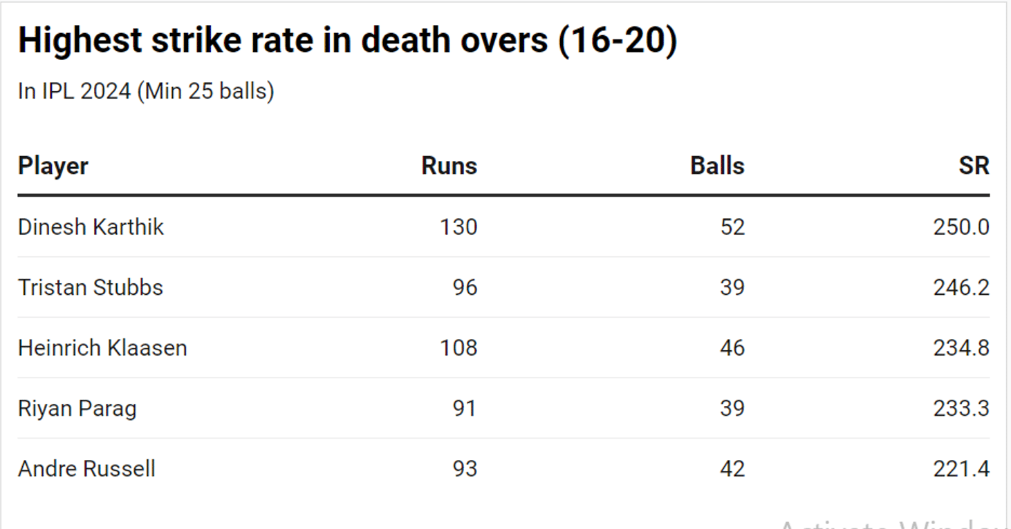 For RCB, other than Kohli, if there has been one batter who has been consistent, it is Dinesh Karthik. He has struck at 250 this season – this highest this season, while SRH’s Heinrich Klaasen is not too far behind at 235, just behind Karthik.