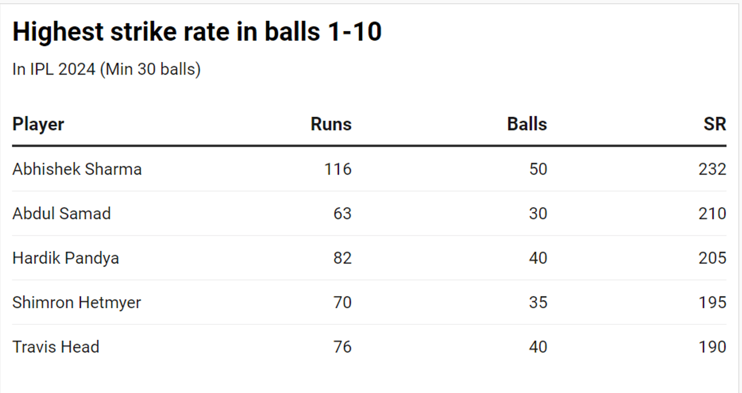 The SRH opening combination of Abhishek Sharma and Travis Head have been among the best this season. Their runs have come at a strike rate of 177 (ave 42.4) and it's been the catalyst behind SRH getting huge totals this season. 23-year-old Abhishek has had a breakout season. He has not registered an innings with a strike rate of under 145 this season, and his strike rate of 232 in the first 10 balls is the best this tournament.