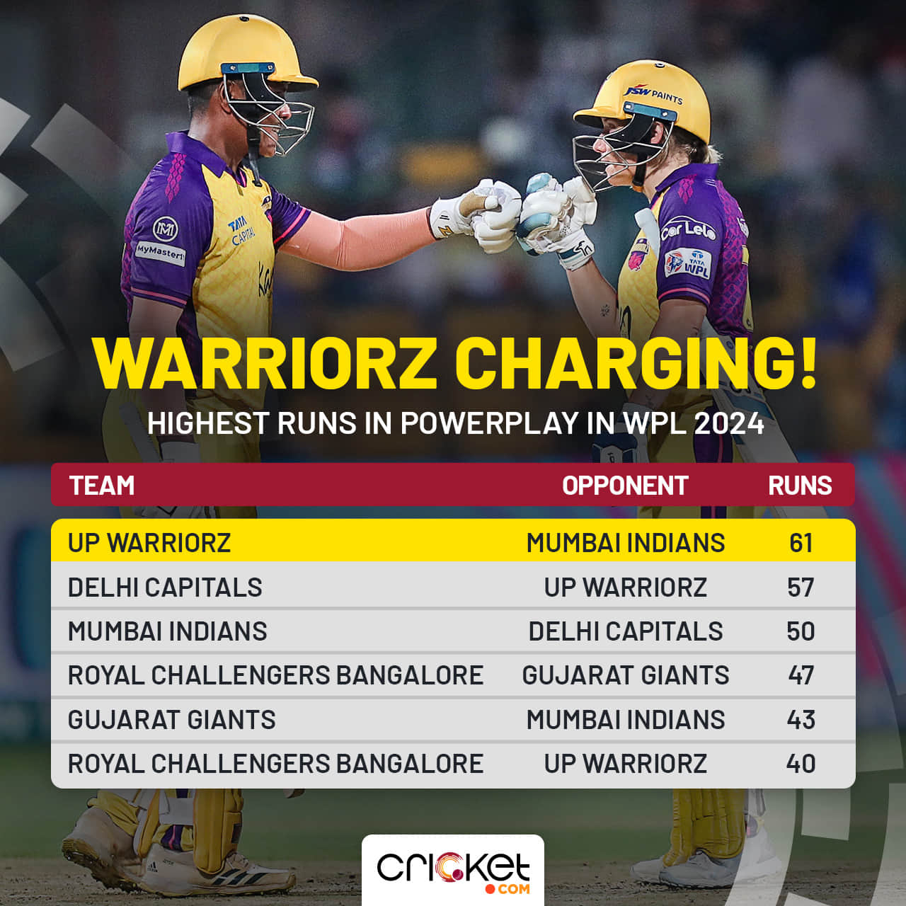 Navgire’s fifty came in style when she hit Matthews for a second six. It was the joint-fastest half-century for Warriorz and the only sub-30-ball half-century against Mumbai Indians ever in WPL history.