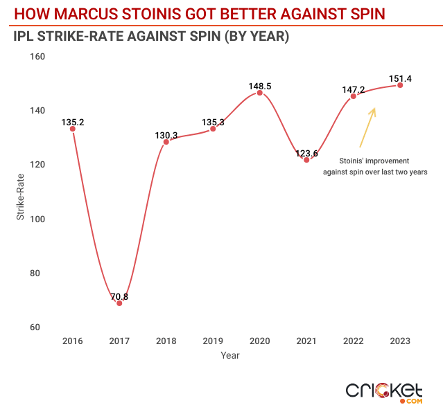 In the two IPL seasons that followed, there was a conscious effort from Stoinis to up the ante against spin. He got out just four times out of 17 innings and scored runs with an average of 45.25 while still striking at 131.16. It wasn’t still glory.