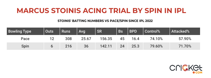 Stoinis’ transformation against spin is a crazy tale. He still looks like a fish out of water when tasked to face the toughest of spinners, like Ravindra Jadeja in Lucknow. But what he has done since then is understood his limitations against certain bowlers while taking on others.
