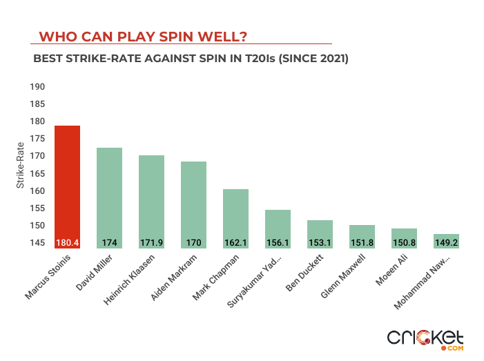 Since 2021, across all T20Is, the right-hander faced some handy opponents, and some quality spinners, in Maheesh Theekshana, Wanindu Hasaranga, Adil Rashid, Shadab Khan and Ish Sodhi. All of them have proven their wicket-taking worth in international cricket. Against all of them, Stoinis has a minimum strike-rate of nearly 160.