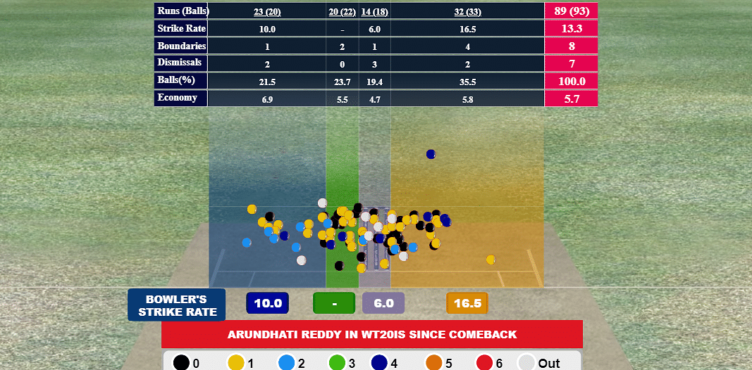 Arundhati hit her natural lengths, but her newly found wrist position and adjustments to her action enabled her to hit the stumps far more accurately, making it tough for the opponents to get away. If you look at her bowling beehive after her comeback against South Africa, it is evident how she has targeted the stumps and has kept things very simple.