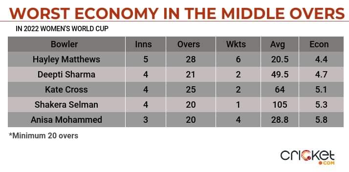 The off-spinner has scalped two wickets at an average of 49.5 and an economy rate of 4.7 runs per over in the middle overs, which is the worst among players with a minimum of 20 overs in this World Cup.