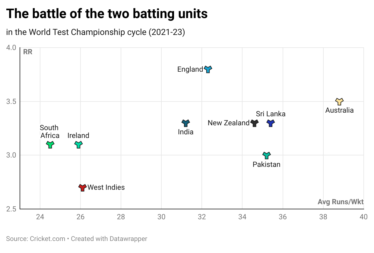 It is The Oval so the conditions will be more batter friendly than other venues in the country. It will start that way, and the battle will be between the two batting units. In the 2021-23 WTC cycle, Australia are the best batting unit, averaging 38.8 and a run-rate of 3.5. Four Australians are at the top of the batting charts - Labuschagne (53.89 average), Khawaja (69.91), Smith (50.08) and Head (52.52) - showing their dominance with the bat.
