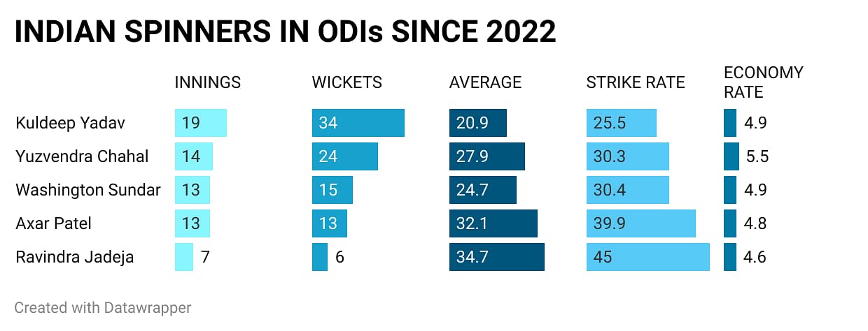 Washington has featured in 16 ODIs, picking up as many wickets at an average of 27.7 and an economy of 5.1. All these finger spinners have an economy of less than five since 2022; however, they won’t give India as many wickets as someone like Kuldeep would do. The left-arm wrist-spinner has a way better strike rate (25.5) than the likes of Jadeja, Axar and Washington, and it’s highly doubtful India would leave him out of the XI.