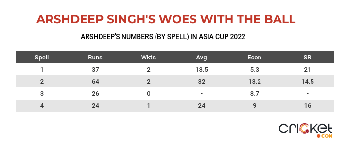 Arshdeep averaged 30.2 with the ball, picking up five wickets, conceding runs at 8.6 RPO. Whilst his numbers are outstanding during his first spell, where he averages 18.5 at 5.3 RPO, in his later spells, he has been a train-wreck. 13.2, 8.7 and 9 in his second, third and the fourth over is exactly what will be worrying the management.