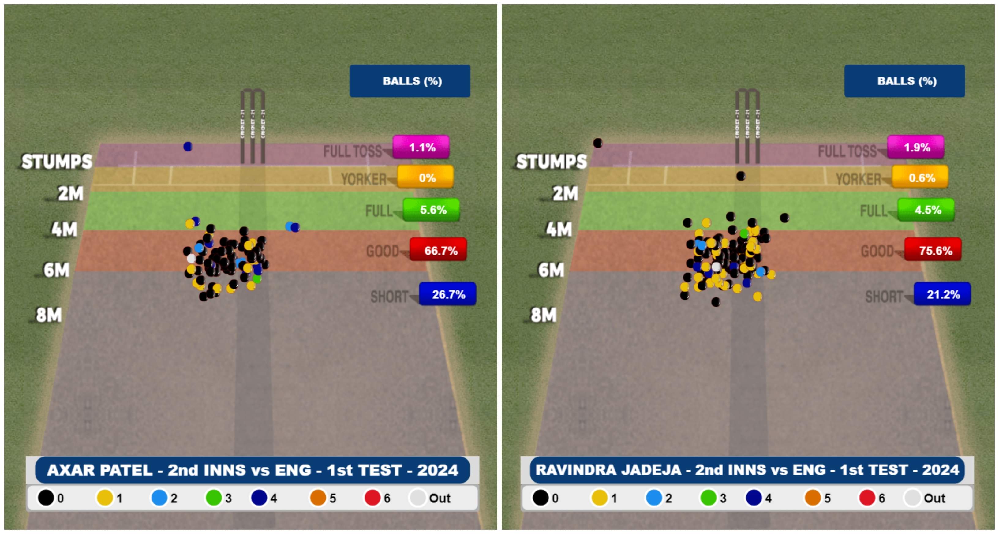 On a slow, Day 3 wicket, the pair struggled to hit that sweet spot consistently. While 21.2% of Jadeja’s deliveries were short, a whopping 26.7% of the balls Axar bowled were 8m or shorter.