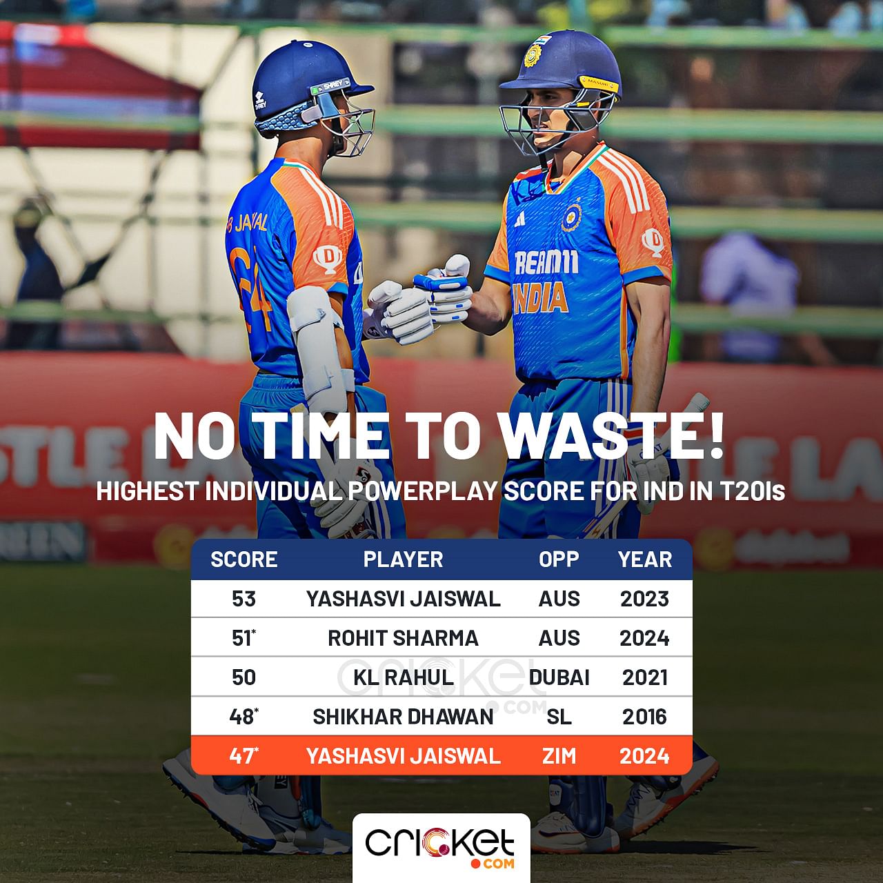 Jaiswal began the chase with a 15-run first over and both he and India never looked back after that. They got to 43/0 at the end of three overs and 61/0 at the end of the powerplay. Jaiswal himself torched the Zimbabwe bowling up-front as he accounted for 47 off the 61 runs scored in the powerplay.