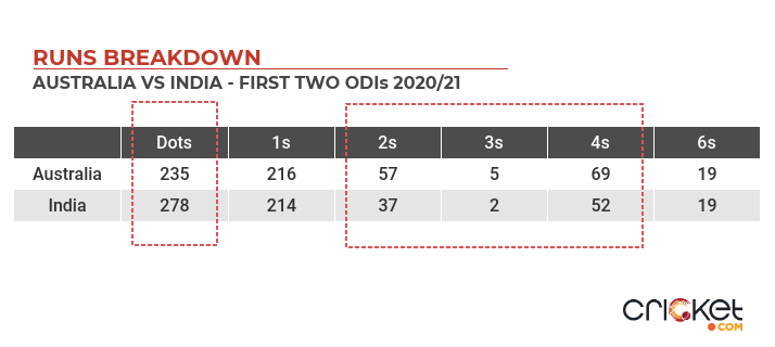 India played 148 dot balls in the first game where they fell short by 66 runs. In the second, they played 128 dot balls in comparison to Australia’s 107 while hitting six boundaries less. By the 40th over, India had already crossed Australia's tally of dot balls.