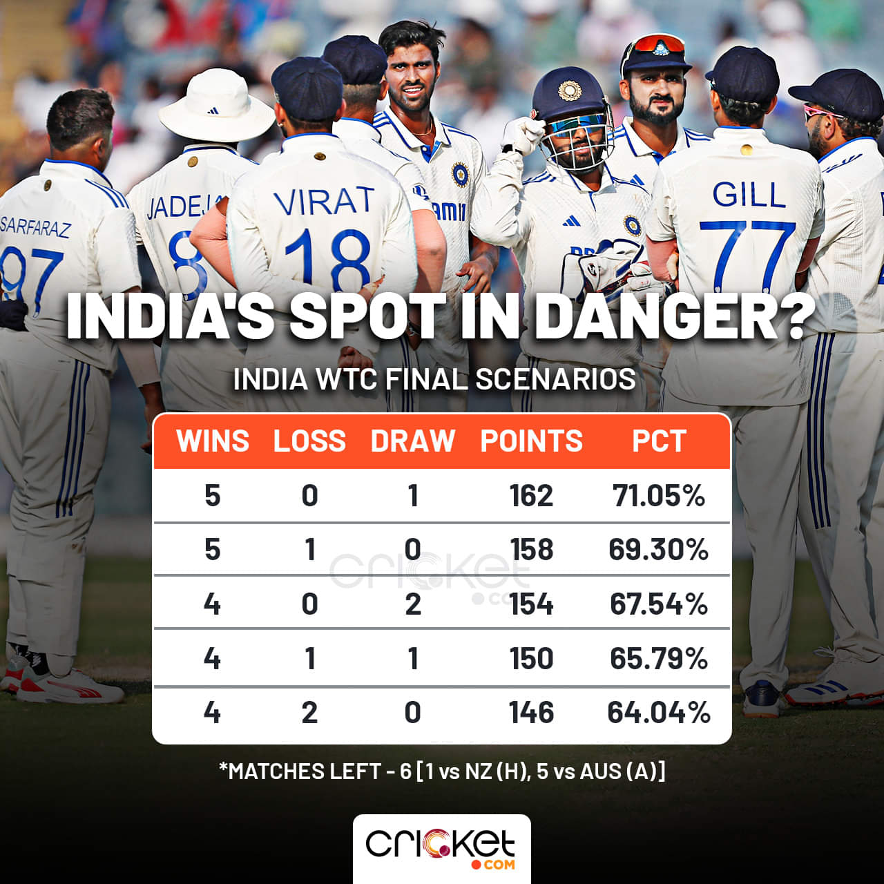 Thus, Rohit Sharma and Co., despite being at the summit of the table right now, are treading on thin ice to make it to their third consecutive WTC final.