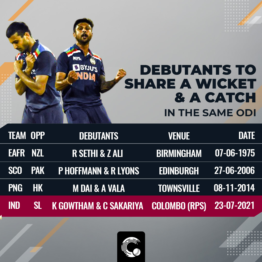 The introduction of Gowtham was an early success. He bagged Minod Bhanuka who looked to sweep the first ball he faced. A lot of credit goes to Sakariya who bagged a low catch. Gowtham in exchange complimented by taking a catch off the bowling of Sakariya to fetch his first ODI wicket. This was only the fourth Instance of debutants sharing a catch and a wicket between each other in ODIs. However, this is only the second instance where both of them were sharing their maiden catch and maiden wicket.