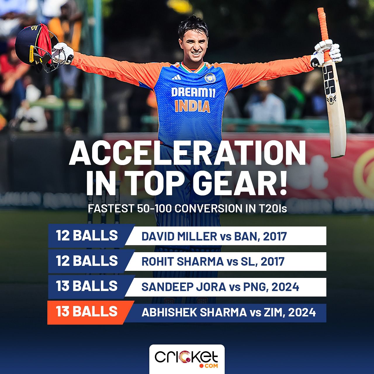Abhishek accelerated from thereon, rushing from 50 to 100 within 13 deliveries, to complete a 46-ball hundred. He was out a ball later but became only the second T20I batter to overcome a duck in his debut with a hundred in the second outing.