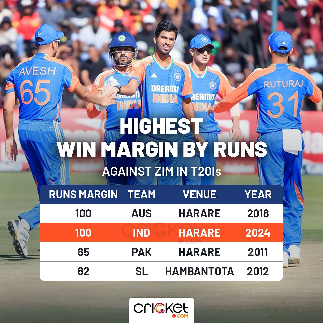 Zimbabwe were never in the game chasing a record total and lost wickets in clusters. The lost three wickets in the 40s (at the scores of 40, 41 and 46), another three in the 70s (72, 73 and 76) and the last three for 17 runs to be bowled out for 134 in 18.4 overs.