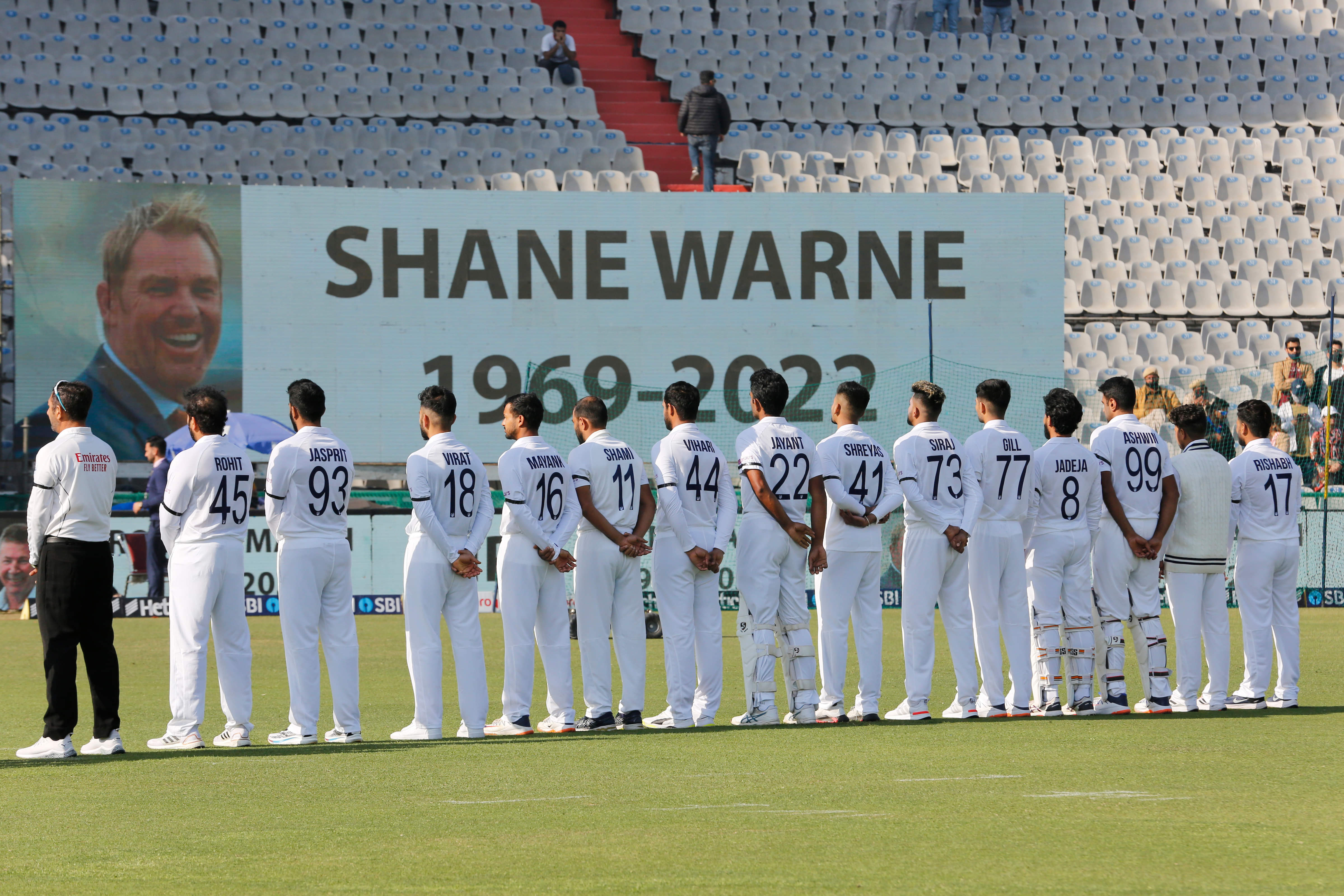 The Indian and Sri Lankan cricketers wore black armbands and observed a minute's silence before the start of the second day's play in the ongoing opening Test to honour the memory of Australian legends Shane Warne and Rodney Marsh, both of whom passed away within hours of each other on Friday.