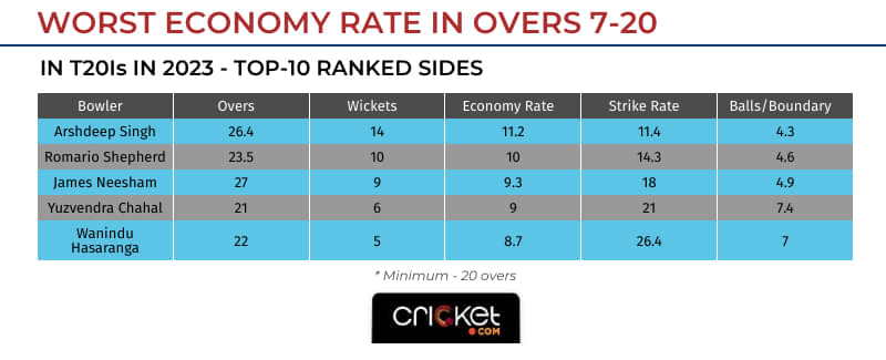 Post powerplay, he has leaked runs at an economy of 11.2, which is clearly the worst amongst bowlers from the top-10 ranked sides who have bowled at least 20 overs in the last two phases (middle and death) phases of the innings. Arshdeep also has the worst balls/boundary (4.3) in this period.