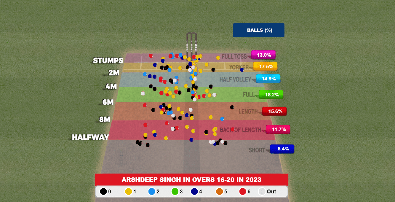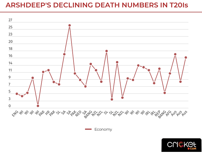 What’s obvious to see is that Arshdeep is no longer able to bowl or execute yorkers seamlessly. Either that, or he’s changed up his tactics and has shifted away from trying to hit the blockhole. Whatever the reason might be, his numbers have suffered as a result.