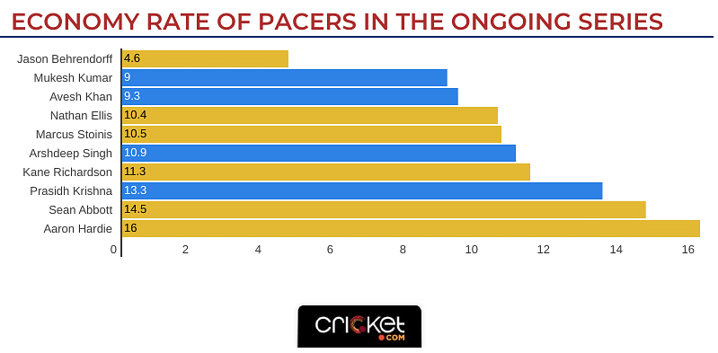 In a series in which no pacer that’s sent down 4+ overs has managed to maintain an economy under 9.0, the Western Australian has gone at 4.6 RPO while averaging 18.5. He’s managed to keep every Indian batter, including Suryakumar Yadav and Yashasvi Jasiwal, quiet.