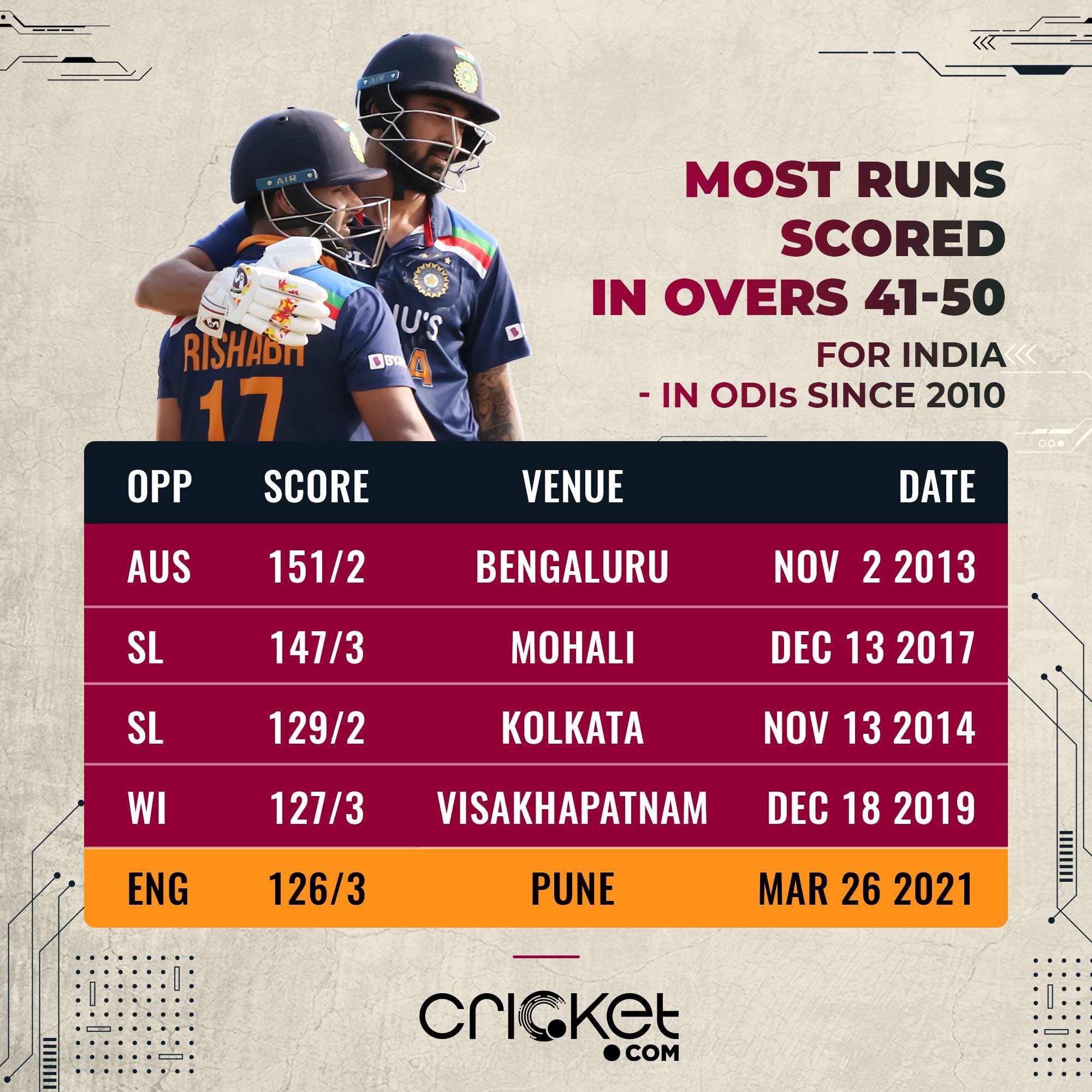 Rahul's departure actually worked in India's favour as Hardik Pandya arrived at the crease and hammered two sixes in his first three deliveries. Both Pant and Hardik smashed sixes for fun and put England on the back foot. Pant hit seven sixes and three fours in his 40-ball 77 - his highest ODI score - before perishing in the 47th over. Hardik however kept the attack going and struck four sixes during his knock, giving India a rapid finish.