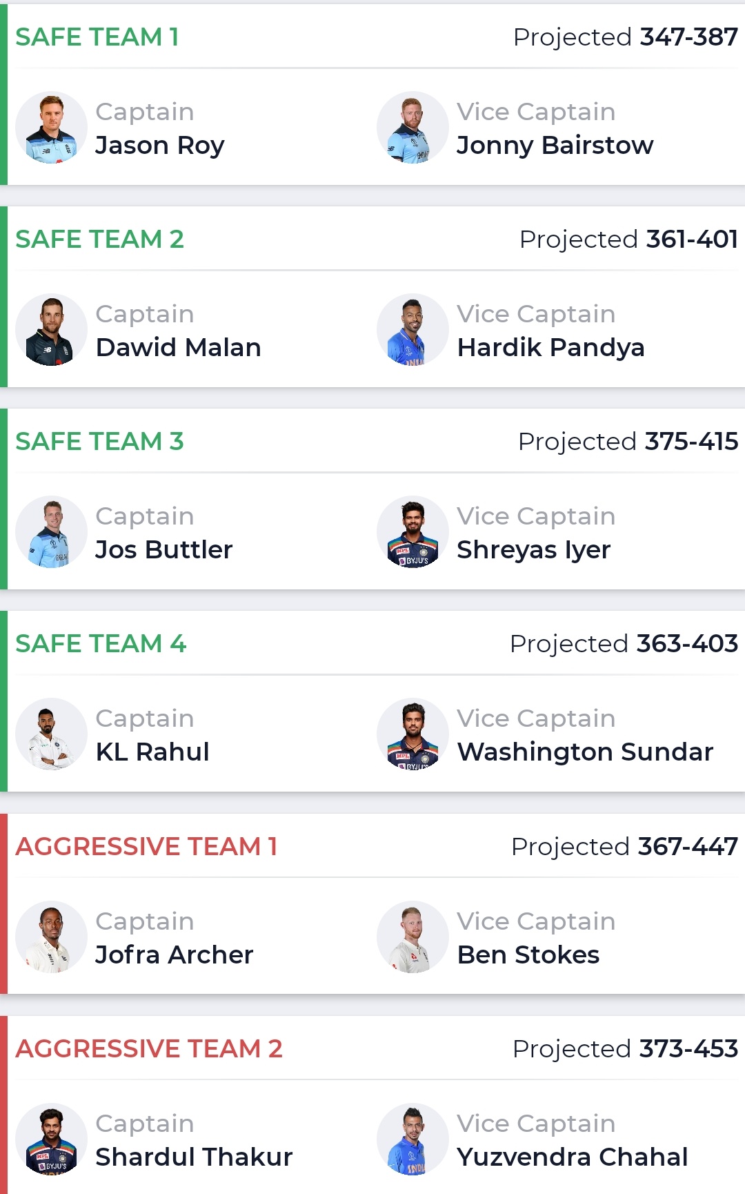 While you could go for the above team, you also have the option of choosing your own team from cricket.com’s Fantasy Research Centre. Based on algorithms we have come up with six different teams that could fetch you crucial points.