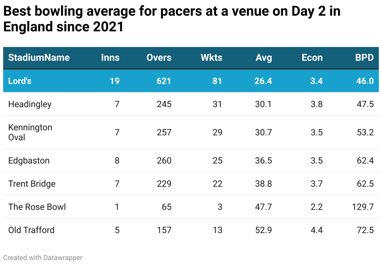 Lord's will continue to provide assistance for the pacers on Day 2 as they average 26.4, which is far better than all other venues in England. They have taken 81 wickets, maintaining a good economy rate of 3.4. Expect the likes of Jasprit Bumrah and Mohammed Siraj to play a big role in dismantling England.