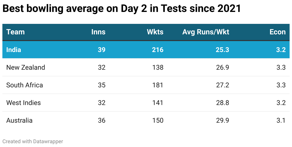 Indian bowlers have been excellent on Day 2 in recent years. Since 2021, they have taken 216 wickets, and average a staggering 25.3. Expect the Indian bowlers to be more lethal on Day 2 and dismiss the England batters cheaply by 350.