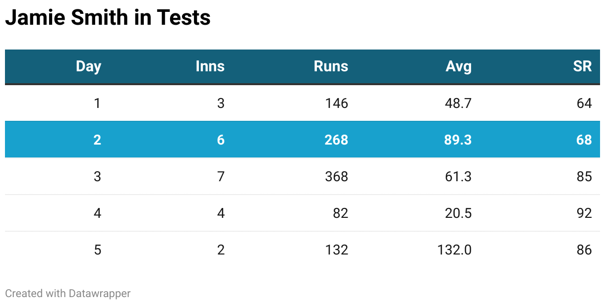 Jamie Smith will be a massive factor in England posting a massive total in the first innings. In his career so far, Smith's best batting has been on Day 2, where he averages 89.3, which is his best among the 5 days of a Test.