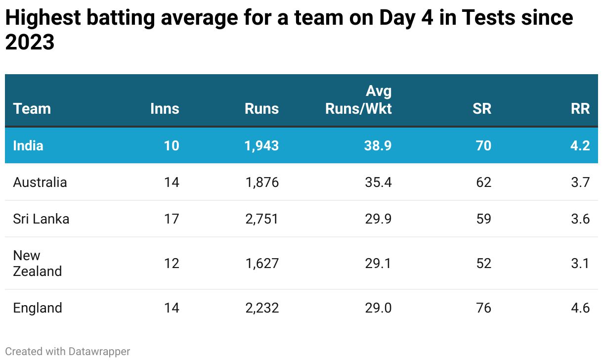India have done well on the fourth day of Tests in the last couple of years, with an average of 38.9, which is the best for any team. They have scored at an excellent run rate of 4.2, which is bettered only by their opponents, England. With Rahul and Gill showcasing positive intent, expect Team India to score at a similar rate tomorrow.
