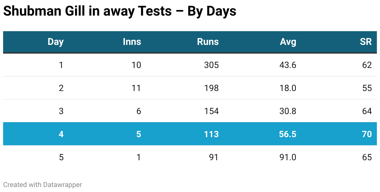 Shubman Gill has a record of doing well in the second innings compared to the first. With the pitch flattening out, run-scoring in the latter half of the Test match is a lot easier than in the first couple of days. Gill, who is looking to improve his record outside home, has managed to maintain a good record on Day 4, averaging 56.5 and striking at 70.