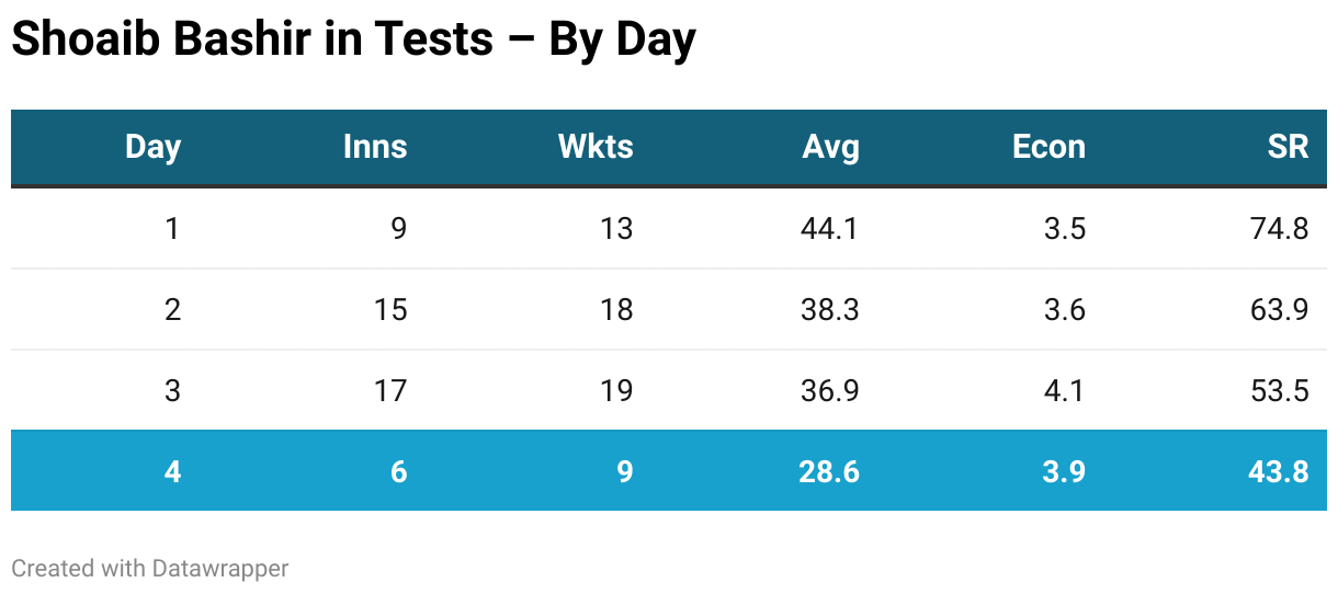 Shoaib Bashir has grown as a bowler in Tests since his debut against India in early 2024. Like other spinners who take advantage of the rough created on the pitch on Days 4 and 5, Bashir too has managed to do so, maintaining a bowling average of 28.6, which is his best on any day. It will be interesting to see how much he will trouble the Indian batters on Monday.