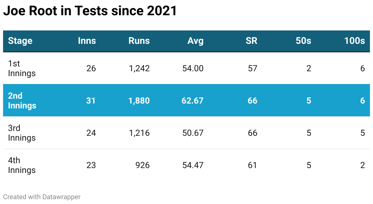 Joe Root will be a massive factor on Day 2 as the legendary Englishman has scored the most runs in the second innings of a Test since 2021, with 1880 runs. He has averaged 62.67, which is his best across the four innings of a Test match. He has smashed more centuries than fifties with six hundreds and five half centuries. Expect a big score from Root by the end of Day 2.