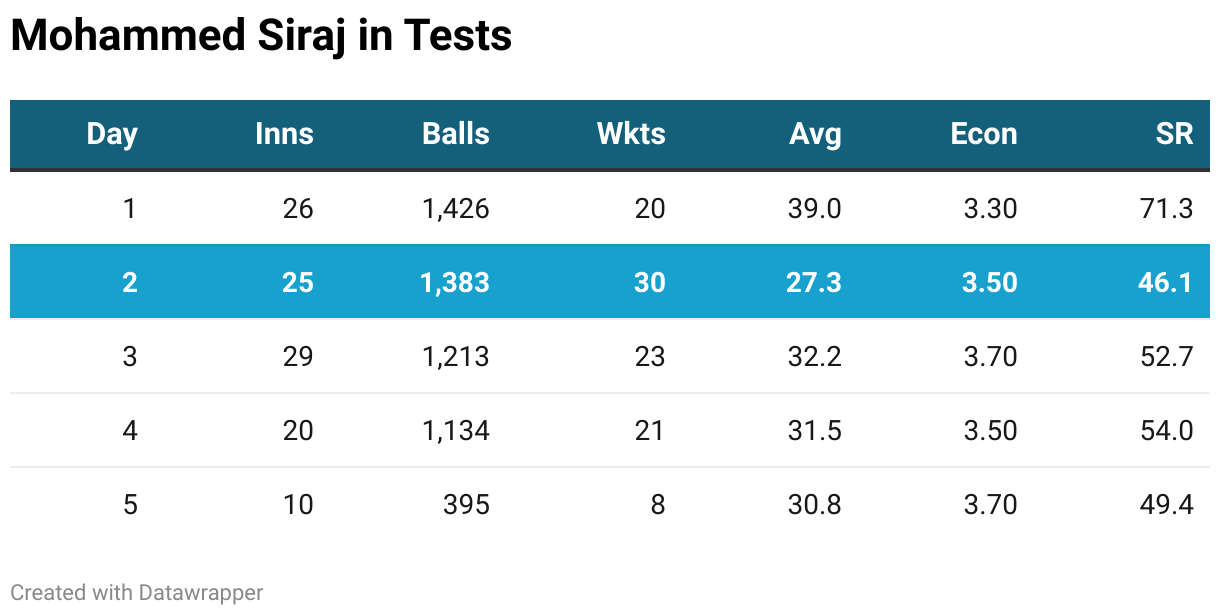 Mohammed Siraj will have a massive responsibility on Day 2 as the express pacer must lead the bowling attack in the absence of Jasprit Bumrah. In his career so far, Siraj's best bowling has been on Day 2 as he taken 30 wickets at an average of 27.3, which is the most wickets and best average for him in a day. He could turn out to be the best bowler on the day.