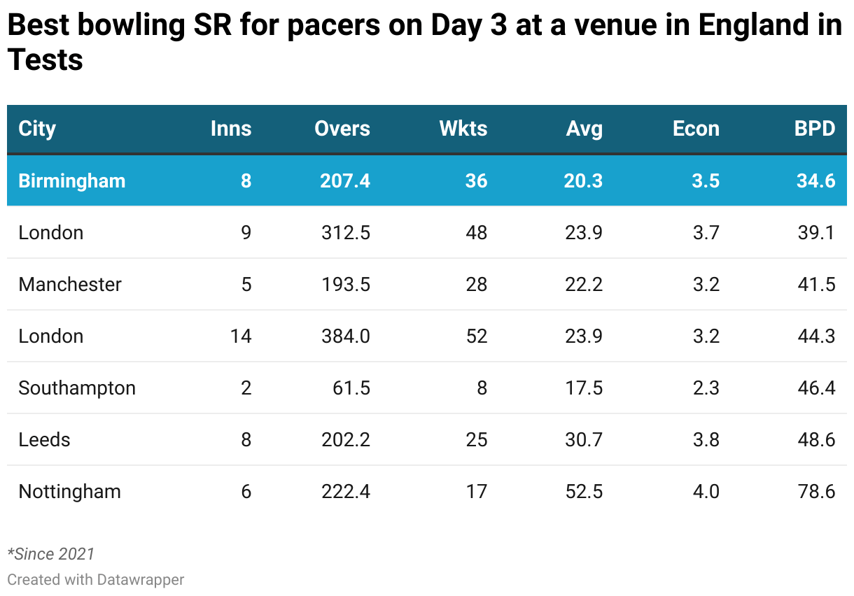Day 3 is the moving day of the Test match as major events will be expected to happen. Pacers are expected to have a good day tomorrow. Since 2021, Birmingham has been the best venue for pacers on day 3 as they have a bowling SR 34.6, which is the best at a venue in England. Indian pacers will be eager to bowl and derail the England batters.