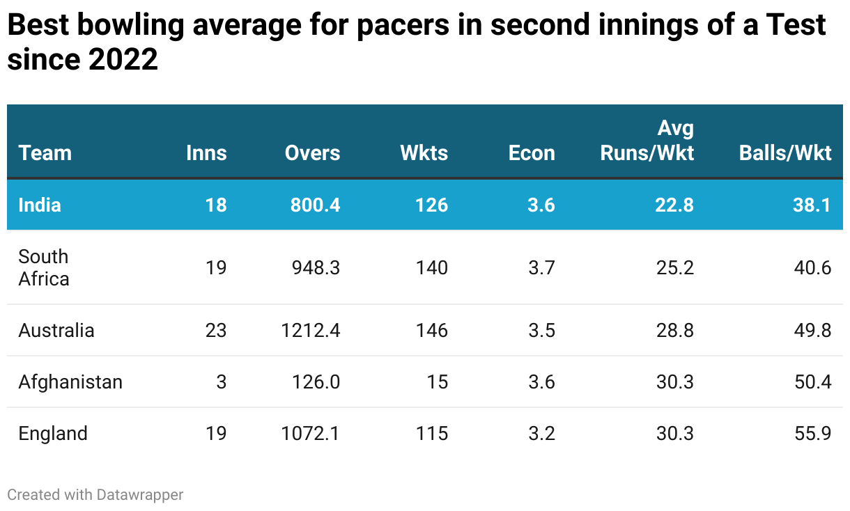 India pacers have been terrific in the second innings of a Test. Since 2022, they have managed to take 126 wickets at an average 22.8, which is right up there as the best. There will be huge expectations on Mohammed Siraj and Akash Deep to deliver. Considering this, don't be surprised if England get bundled out below 350.
