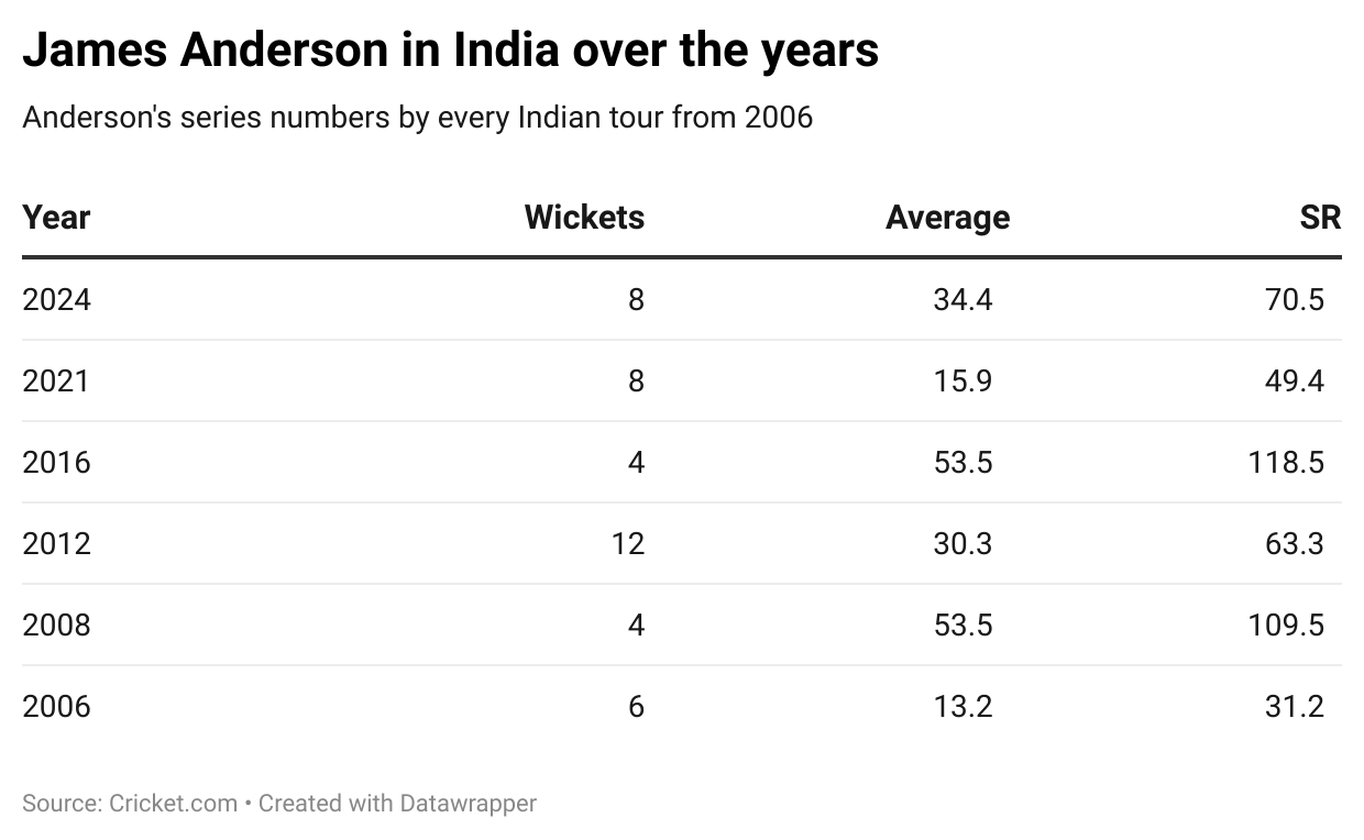 It might seem fitting that James Anderson is edging closer to 700 Test wickets in conditions that could be well overcast. No other pacer has had such endurance as the English pacer has in his illustrious career. In three Tests on this tour to India, Anderson has picked up eight wickets but, at the same time, has had to bowl 94 overs for that.