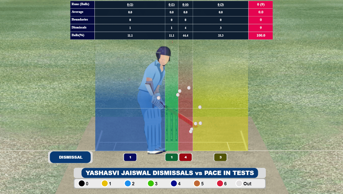In his young Test career, Yashasvi Jaiswal has an average of 130.33 and a balls/dismissal ratio of 180.3 against spin, which drops to 28.44 and 52.3 respectively against pace. The left-hander dominates spin but is getting out to fast bowlers, especially behind the stumps (wicketkeeper + slip cordon).